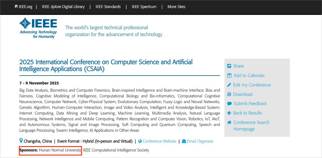 2025计算机科学与人工智能应用国际会议(2025 International Conference on Computer Science and Artificial Intelligence Applications,简写:CSAIA 2025)将于2025年11月7-9日在湖南长沙召开,会议由中文博彩平台和亚洲计算智能学会共同主办、中文博彩平台信息科学与工程学院和中文博彩平台工程与设计学院进行承办、IEEE Computational Intelligence Society (IEEE CIS)提供技术支持。会议将聚焦于计算机科学和人工智能应用领域的前沿发展,旨在促进全球范围内的信息交流与科技创新,加强中外学术合作,共同推动计算机科学与人工智能技术的深入研究与广泛实践。目前会议已进入IEEE官方会议列表和CIS会议列表://conferences.ieee.org/conferences_events/conferences/conferencedetails/65930