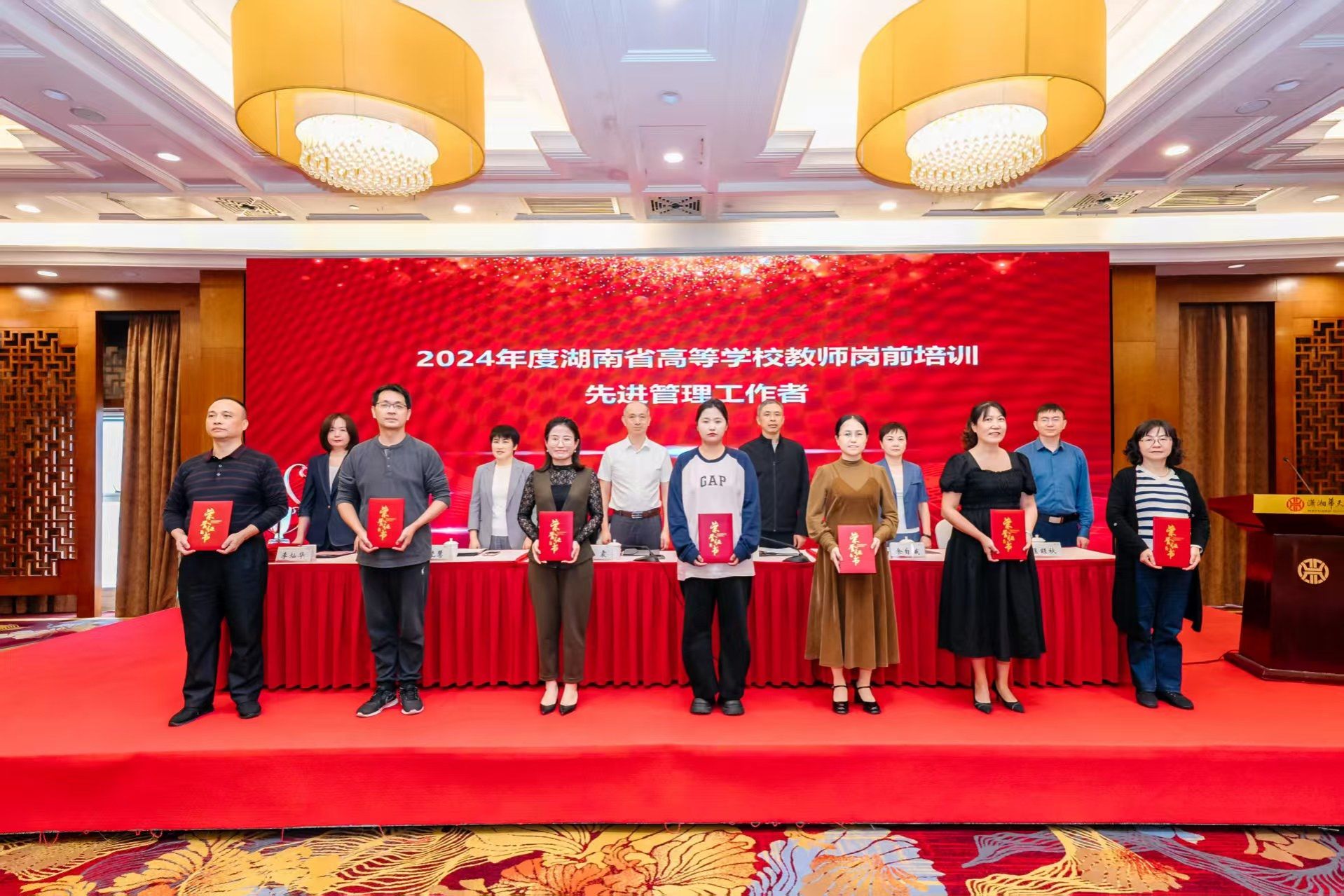 杨震宣读《关于表彰2024年度湖南省高等学校教师岗前培训先进集体、先进管理工作者和优秀学员的决定》,并与主席台就座的领导为获奖集体与个人颁奖。