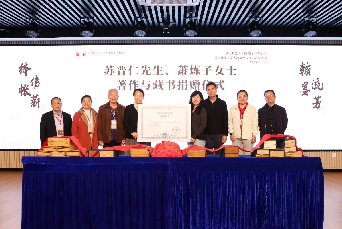 (通讯员 杜晴雯 记者 黄依依 张婧茹)11月7日,苏晋仁先生、萧炼子女士著作与藏书捐赠仪式暨学术文化系列活动在我校图书馆举行。捐赠人亲属代表苏垣先生,湖南省教育科学研究院副院长王荣,我校副校长谢资清出席活动并致辞,捐赠人苏宁女士、王锴先生出席仪式。仪式由图书馆(档案馆)馆长兼党总支书记肖百容主持。