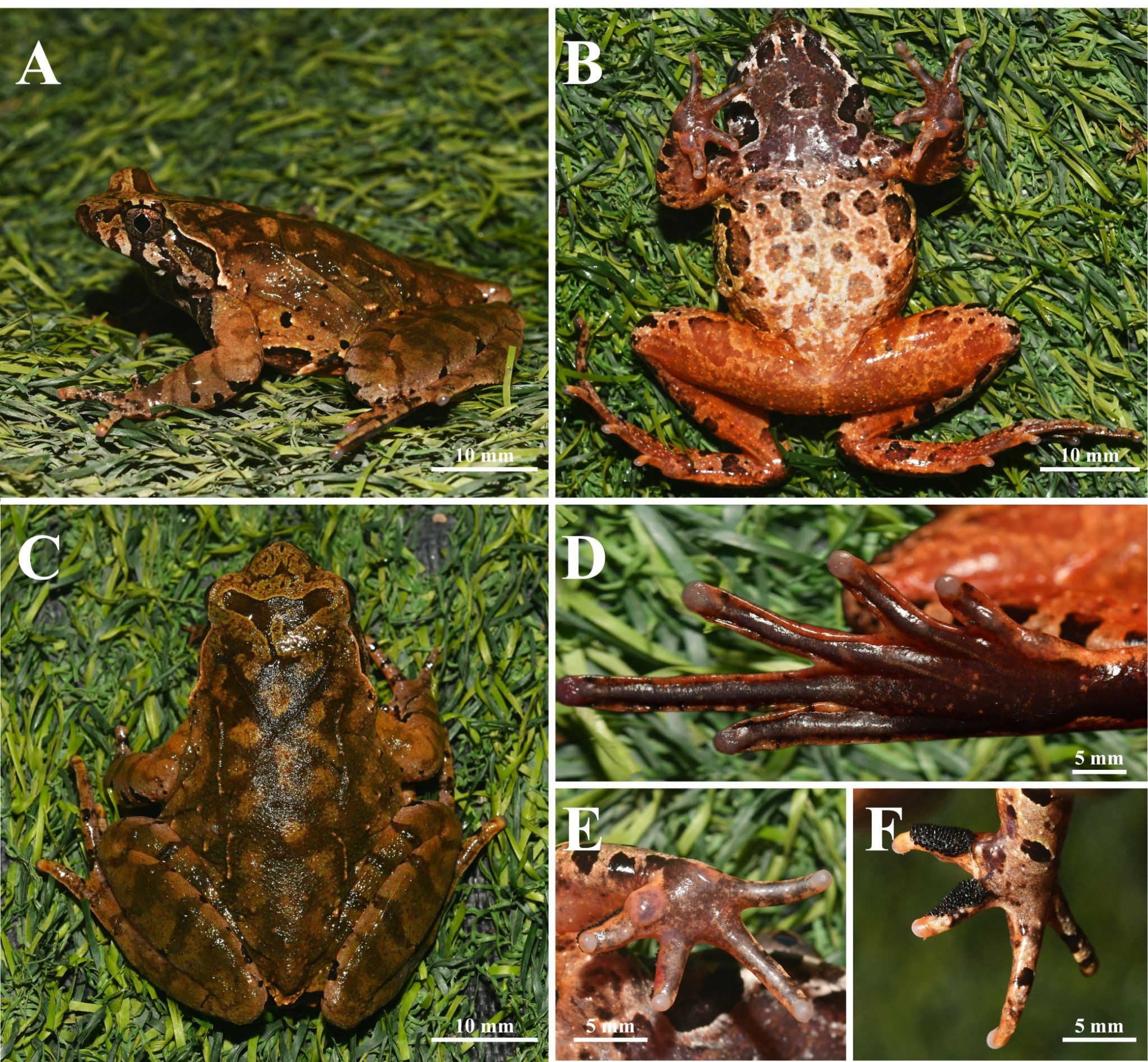 研究人员将悠然角蟾与近缘种进行形态特征比较发现,悠然角蟾体型中等偏大,雄性体长45.3至51.1毫米,雌性55༺.6至58.2毫米;头部宽度大于头部长度,四肢修长,胫跗关节前伸可超过吻端;趾间具微蹼并伴有发达的侧缘褶;繁殖期雄性内侧两指具有密集而中等大小的黑色锥状婚垫刺。这些特征组合可有效的将其与同种组内其他物种区分开来。研究团队确认该类群在形态特征和分子系统学上均显著区别于已知近缘🌼种,为角蟾属一新种。